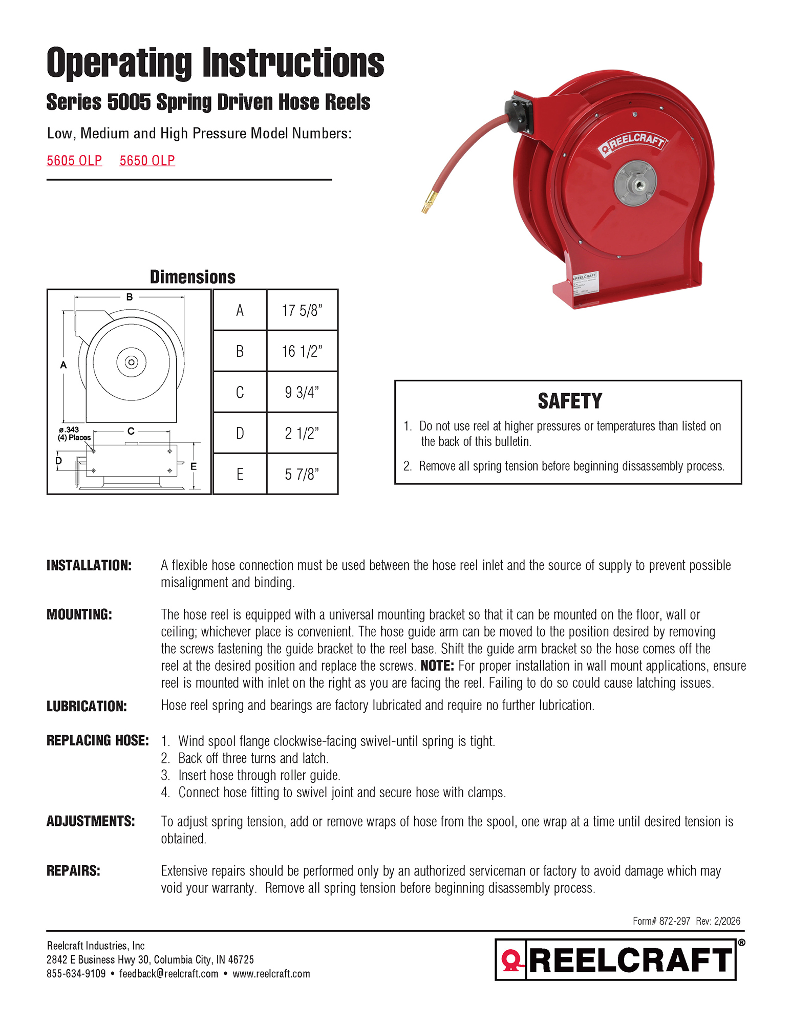 Equip your automotive shop, heavy equipment facility, service truck, or industrial plant with a 5650 OLP premium duty air hose reel built for demanding, high-use applications.
