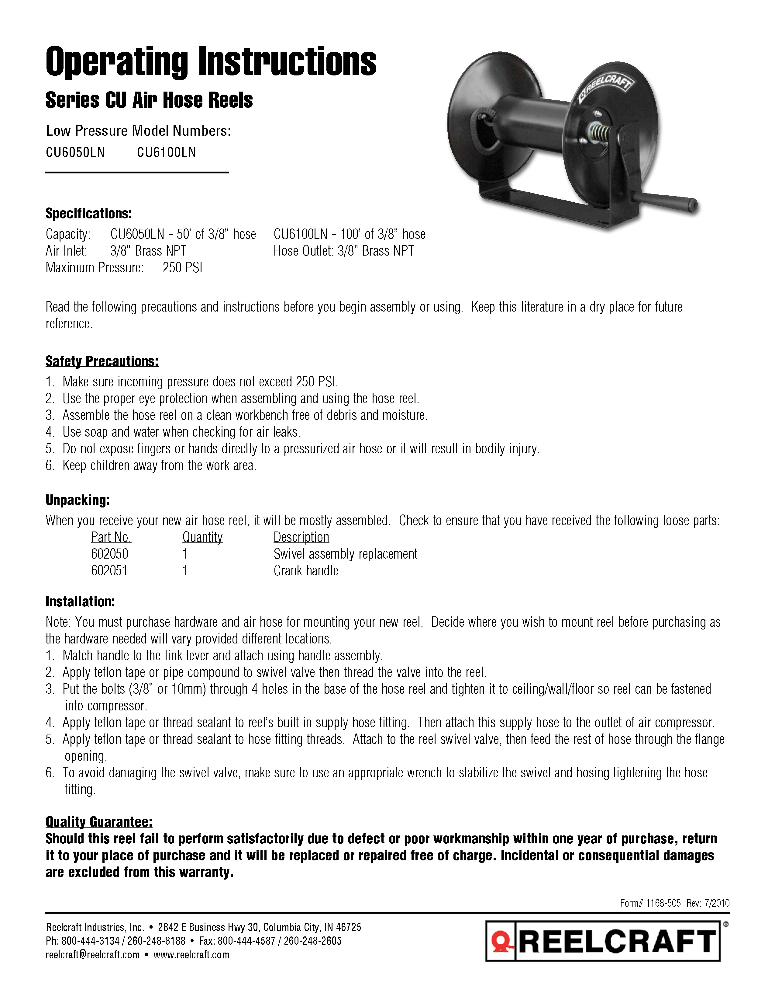 10 business day estimated lead time. For large quantities, please consult Reelcraft Customer Service.