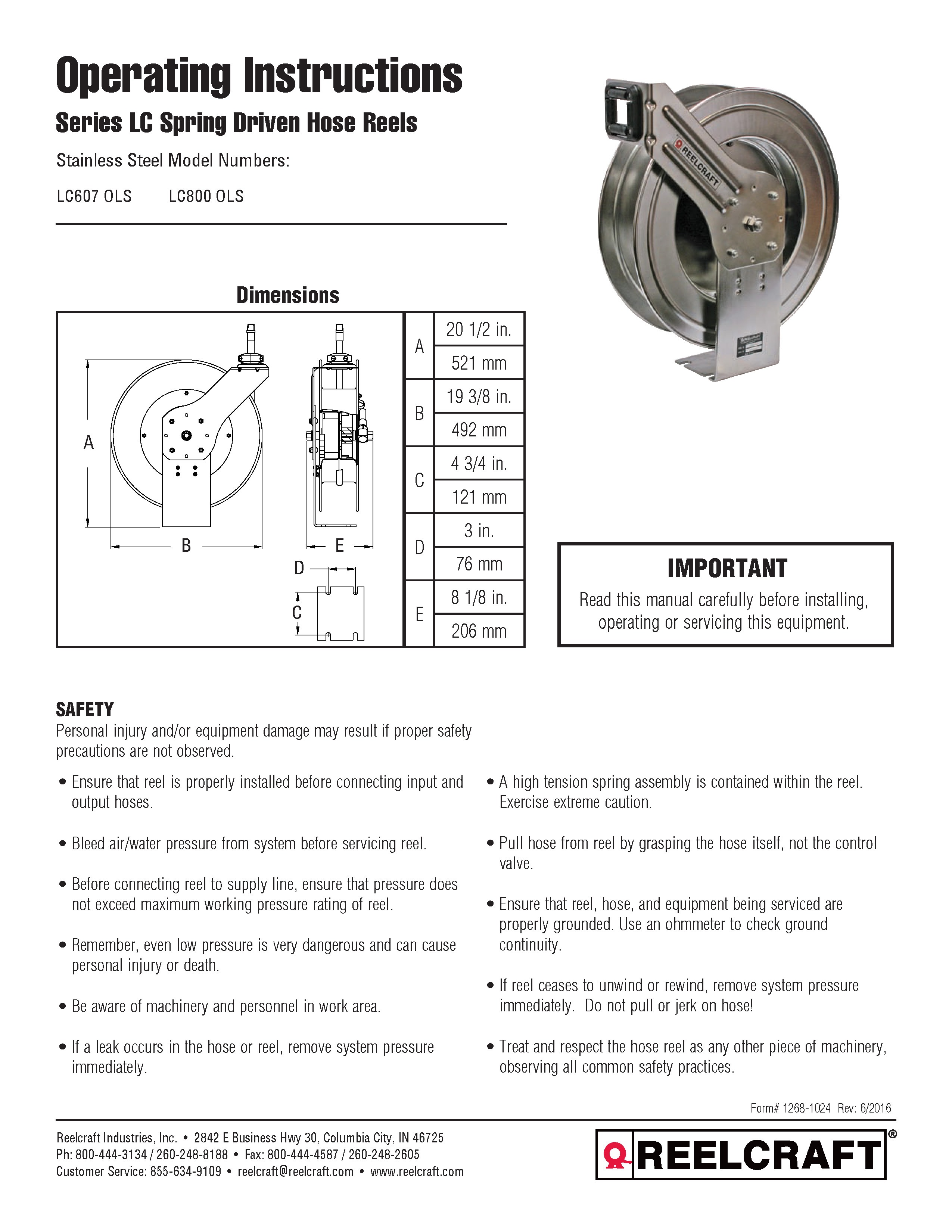 Reelcraft’s Series LC stainless steel hose reels are developed for light-duty, spring-driven hose reel applications in corrosive or sanitary environments. Designed for stationary indoor and outdoor use, these reels can be attached to most surfaces that can be drilled. The reel is built with high quality stainless steel components for maximum corrosion resistance. The four base slots allow the reel to be easily mounted or adjusted. The eight position ratchet locks the reel at the desired hose length while the guide arm adjusts to five convenient positions. **Series LC reels have a brass swivel.**