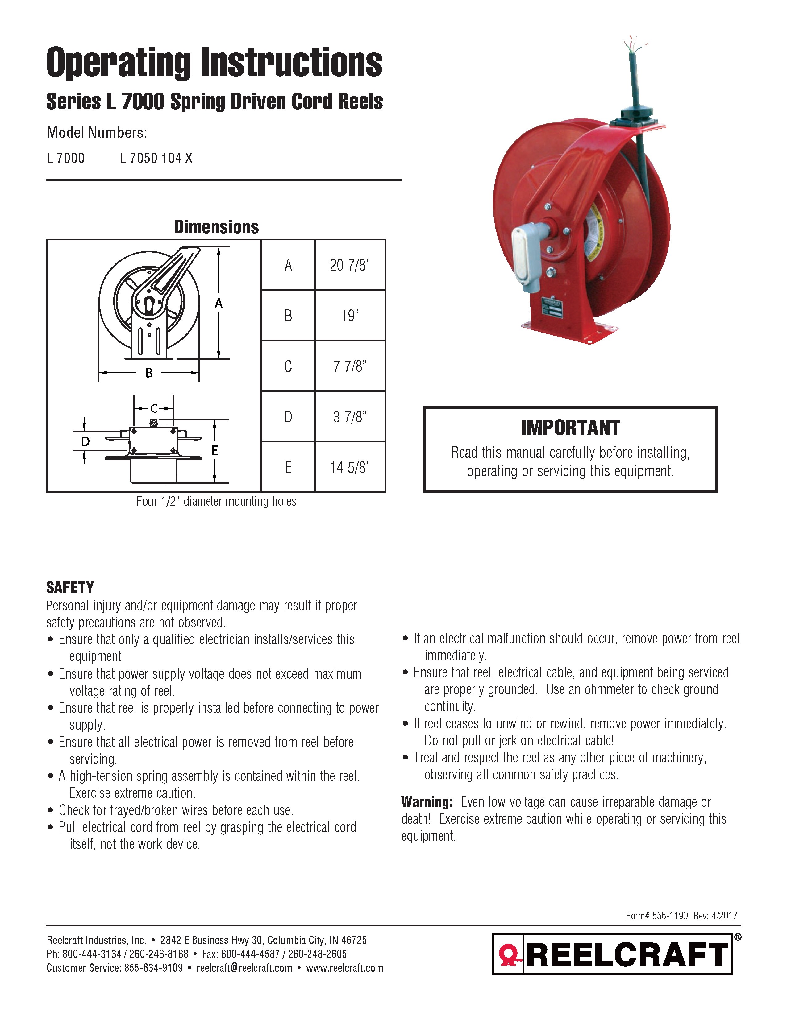 The Reelcraft Series L 7000 power cord reel offers a variety of outlet styles to suit your power needs. Built for strength and durability, these reels feature a robotically welded heavy-gauge steel frame that mounts easily to most structurally sound surfaces. Ideal for indoor, non-weather tight applications, they are UL and CSA approved for safety and reliability.