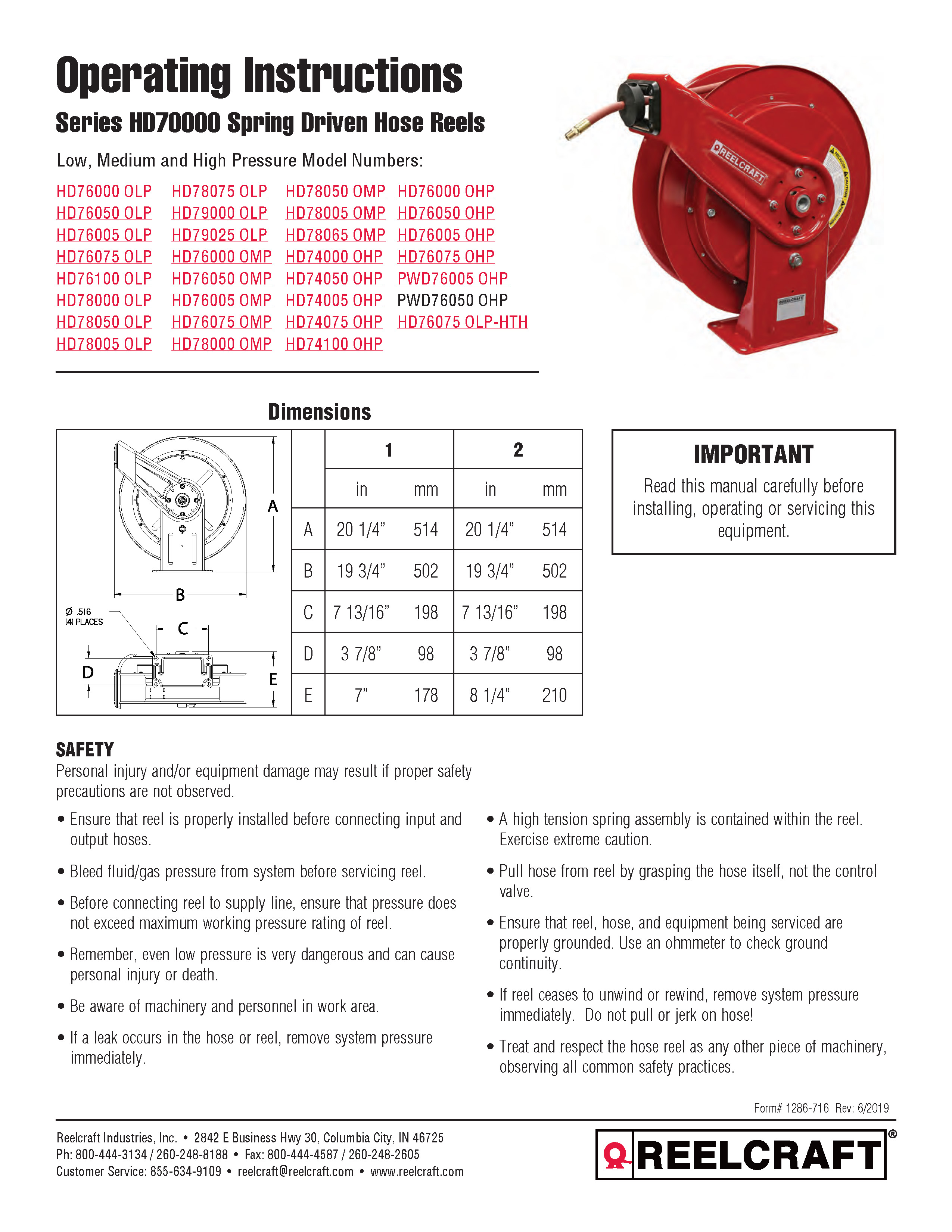 The Reelcraft Series HD70000 hose reels incorporate a heavy-duty base design, all-steel construction and a baked-on powder coat finish to produce a rugged, corrosion-resistant product.